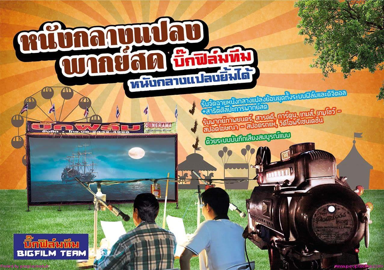 บิ๊กฟิล์มทีม รับจัดฉายหนังกลางแปลงในงานต่างๆ ในราคาเป็นกันเอง..จัดฉายทั้งระบบฟิล์มและดิจิตอล ซีเนม่า ภาพ-เสียงคมชัด ฟังสบายหู ดูสบายตา..ด้วยภาพยนตร์ดีๆ จากหลายค่ายผู้สร้าง..และเนื้อหาตามธีมที่ท่านต้องการ..มีจอหลายขนาดตามความเหมาะสมของสถานที่...พิเศษมีบริการฉายด้วยอุปกรณ์การฉายแบบโบราณ พากย์สด ย้อนบรรยากาศวันวาน ด้วยศิลปินนักพากย์ฝีปากเอก...งานบุญ งานบวช งานออร์แกไนซ์ไปทุกจังหวัด...กำหนดวันได้แล้วรีบโทร.หาเราเลย..บิ๊กฟิล์มทีม โทร.082-332-4996, 089-780-6134, 083-449-4942