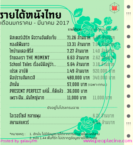 รายได้หนังไทย เดือนมกราคม - มีนาคม 2560